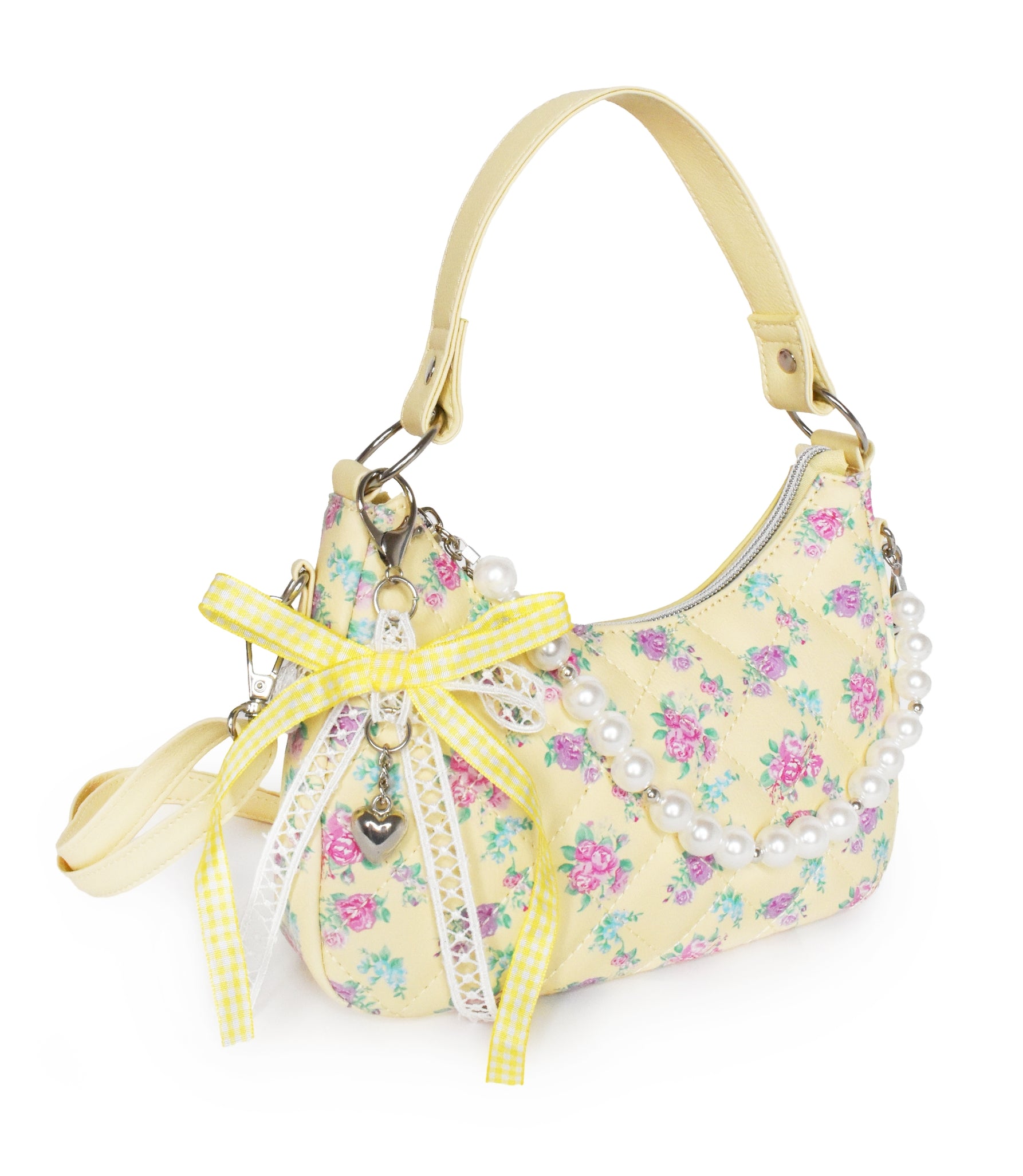 Calling all girly girls! This butter yellow ditzy floral printed mini top handle crossbody is as convenient as it is cute! Featuring a decorative pearl chain and matching butter yellow ribbon for an extra sweet touch!