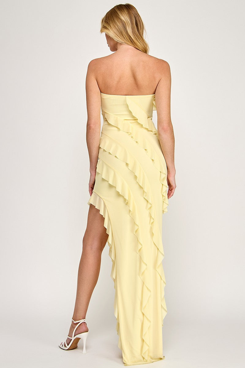 Slip into pure sunshine with the Tiana Maxi in butter yellow! This show-stopping dress features a sleek tube top that hugs your curves, flowing down to a glamorous maxi length. The playful ruffle detail and dramatic side slit add movement and flair, while the side zipper keeps things practical. Bodycon fitted through the bodice, this dress is your go-to for turning heads at any occasion. Effortlessly chic, undeniably stunning.