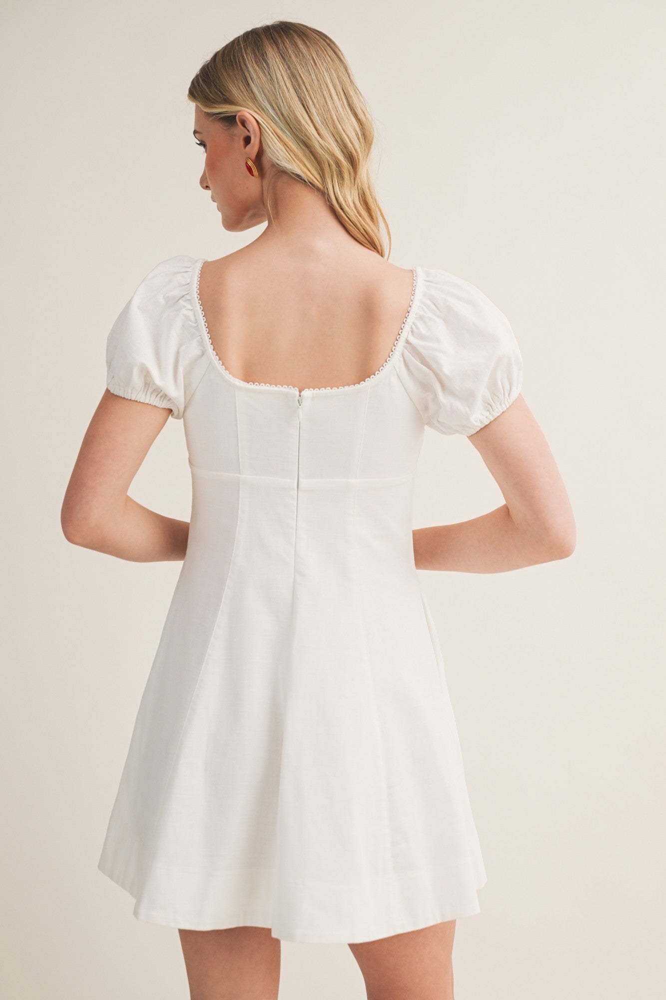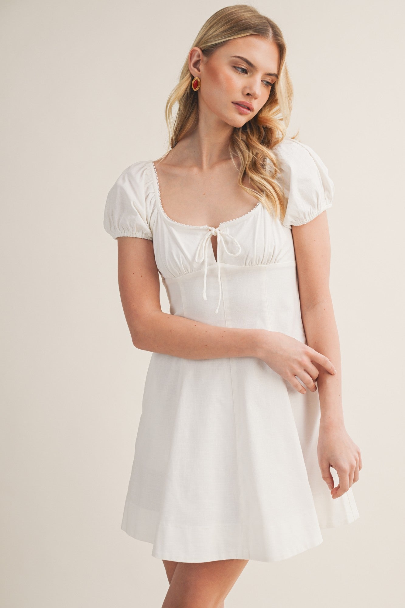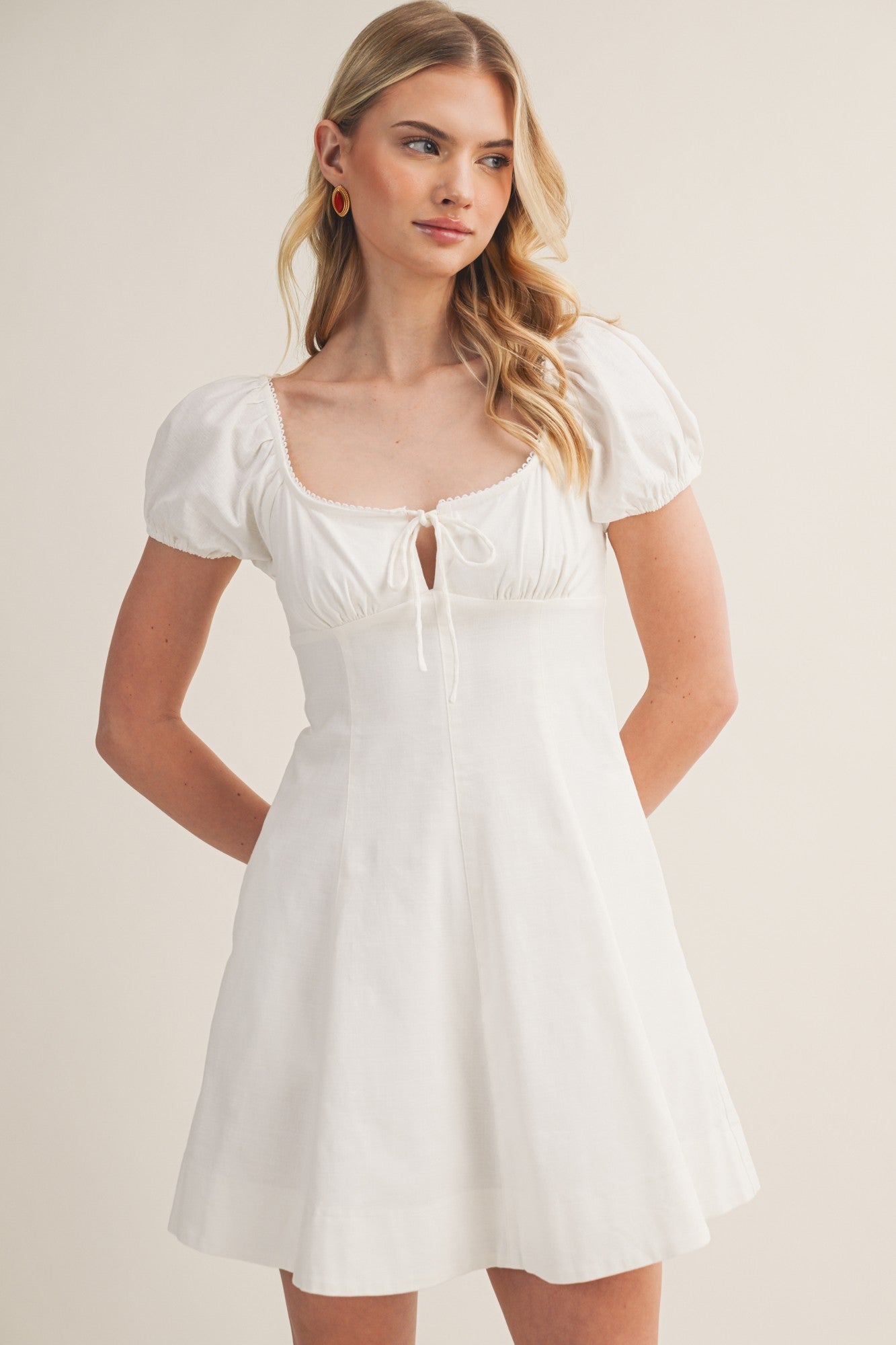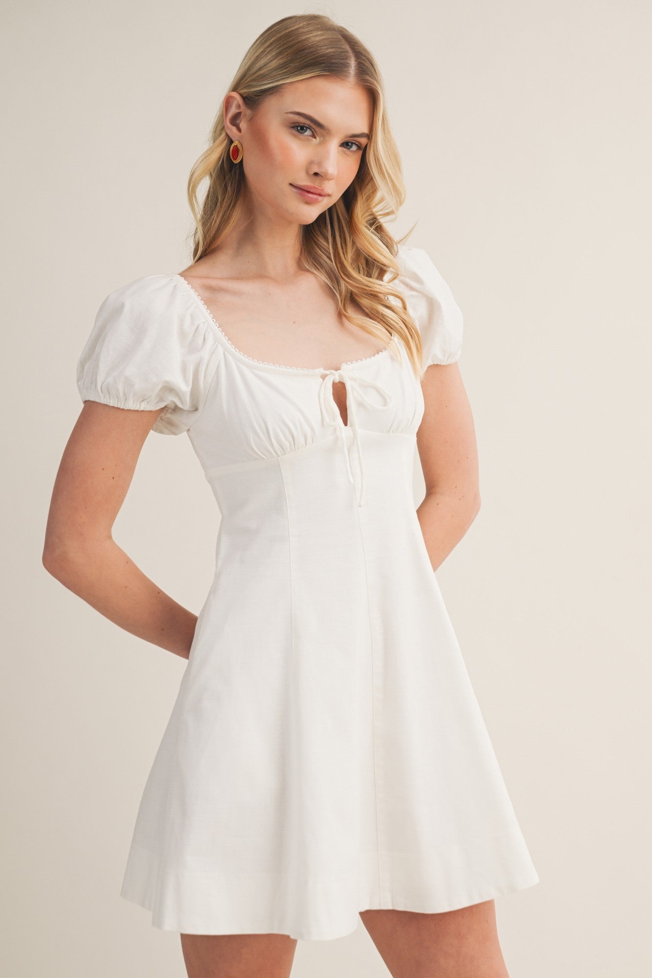 Effortless elegance meets comfort in this charming mini dress. Crafted from breathable stretch linen, it features romantic puff sleeves and a flattering tie-front closure. Delicate lace detailing frames the neckline for a touch of feminine sophistication. Perfect for warm-weather occasions, from casual outings to garden parties. The relaxed fit and quality fabric ensure all-day wearability without sacrificing style.