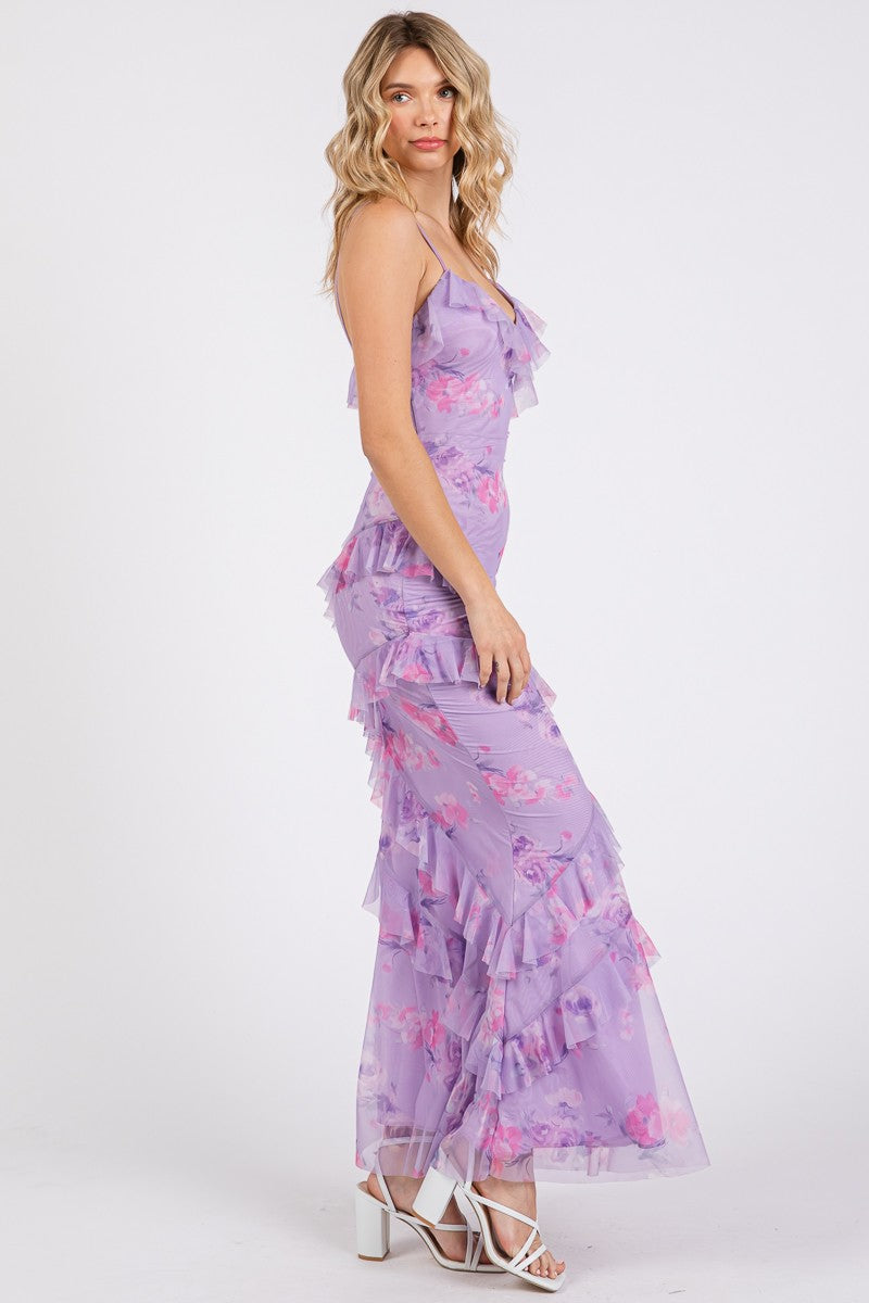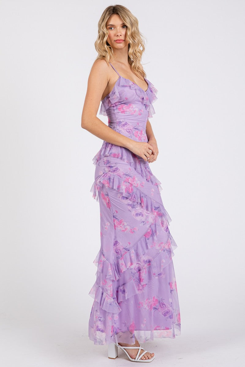 Step into romance with the Violet Bloom Maxi, a lavender mesh stunner that turns heads at every occasion. This dreamy dress features a flattering V-neckline with ruffled trim, adjustable spaghetti straps, and a fitted bodice that flows into an asymmetrical ruffle-adorned skirt. The fully lined maxi silhouette moves beautifully, making it your go-to for garden parties, vacations, weddings, and unforgettable date nights. Pure elegance with a playful twist.