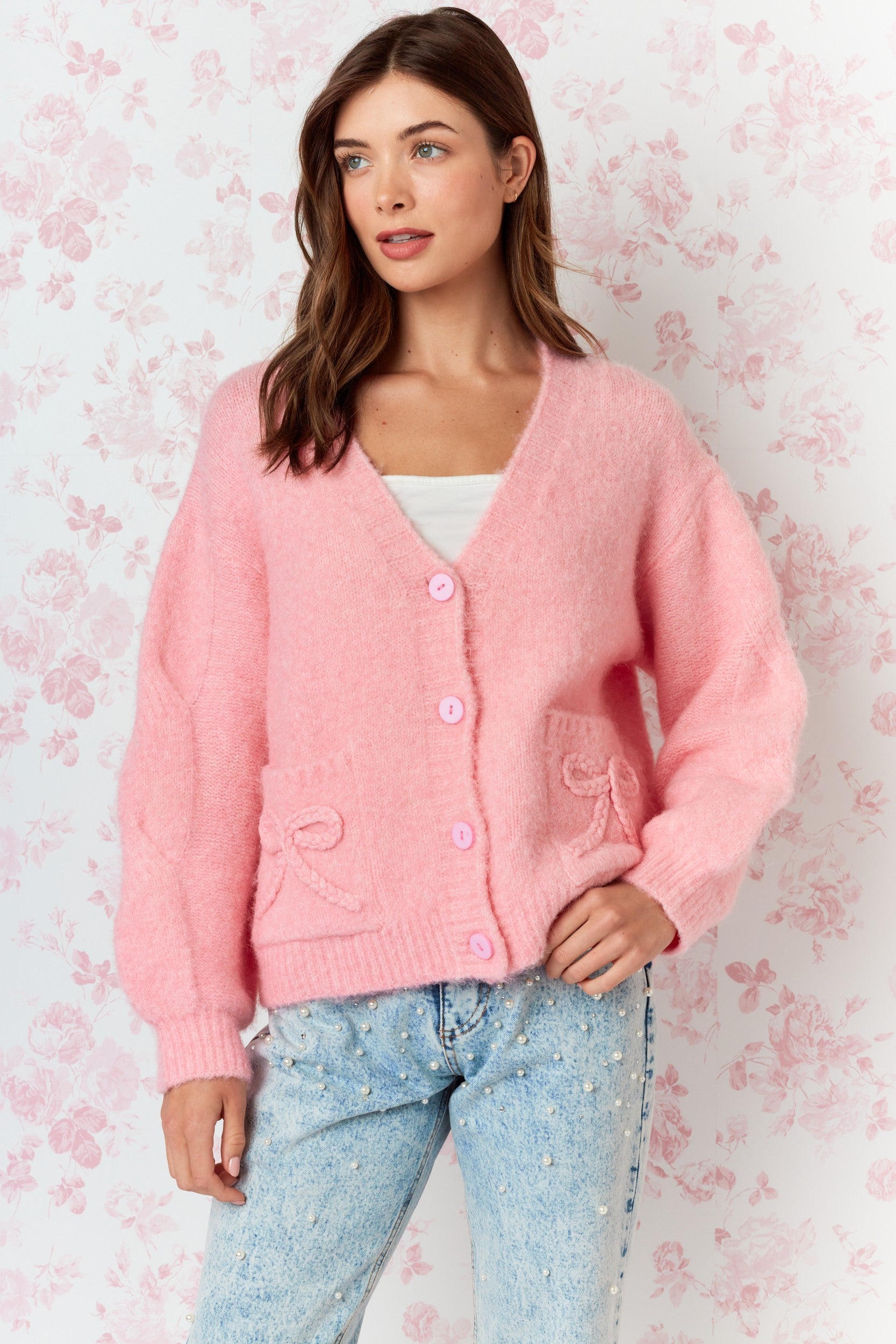 Embrace cozy charm with the Bow Belle Cardigan Sweater in pink! This cropped, boxy fit cardigan features a fluffy soft-touch knit that feels like a warm hug. Playful braided bow details on the front pockets and back add a sweet, whimsical touch. Ribbed cuffs and hem complete the look, making it the perfect layering piece to brighten any outfit with fun and flair.