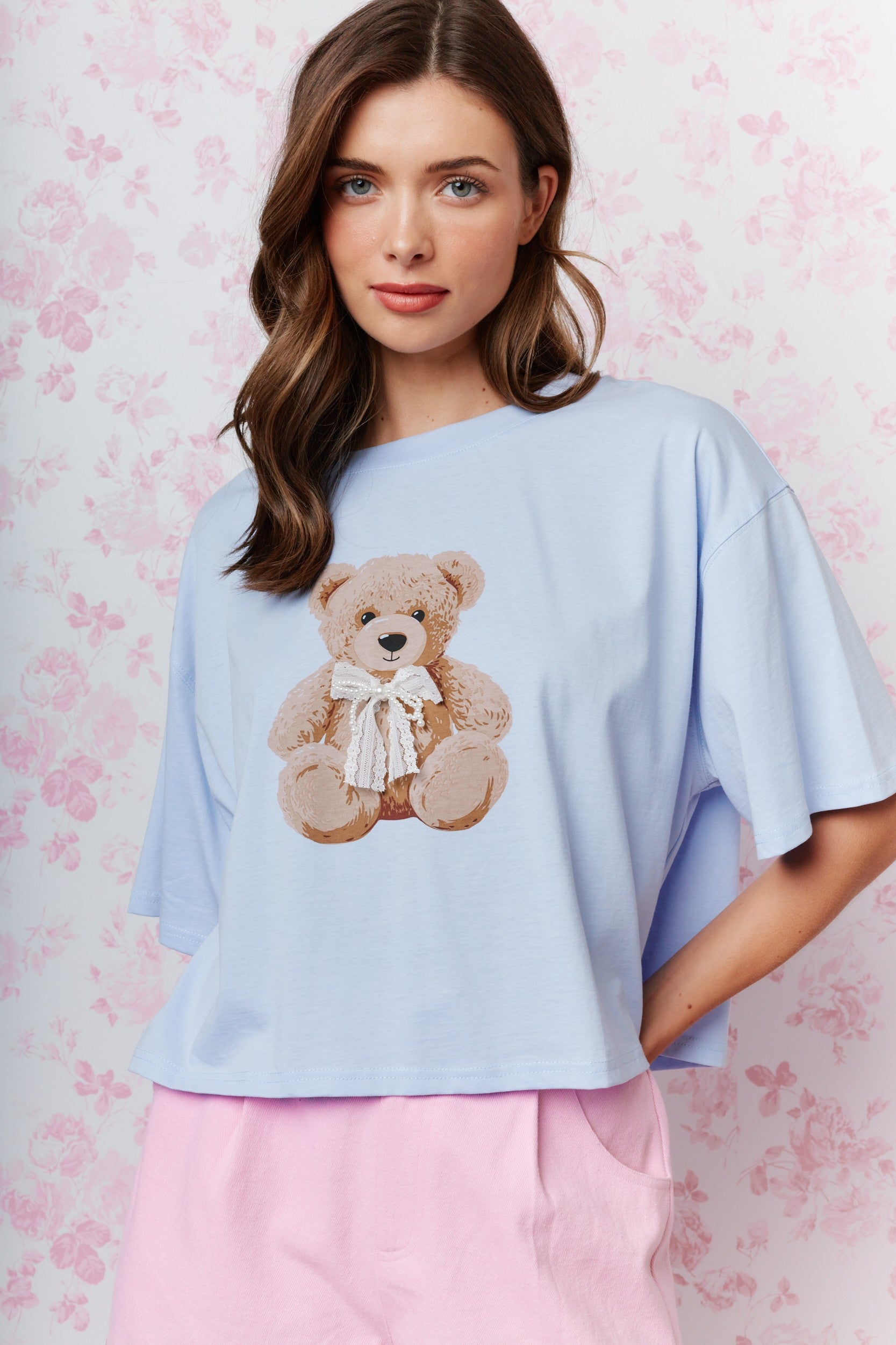 Bring cozy charm to your wardrobe with the Cuddle Bear Oversized Tee in baby blue. This relaxed-fit, slightly cropped shirt features a boxy silhouette for effortless style. The adorable teddy bear graphic is accented with a delicate lace and pearl bow, adding a touch of whimsical sweetness that’s perfect for casual days filled with comfort and smiles.