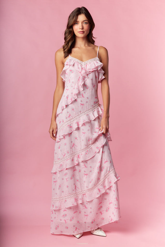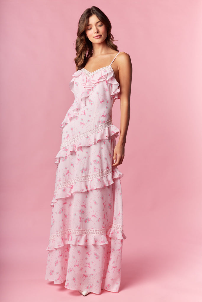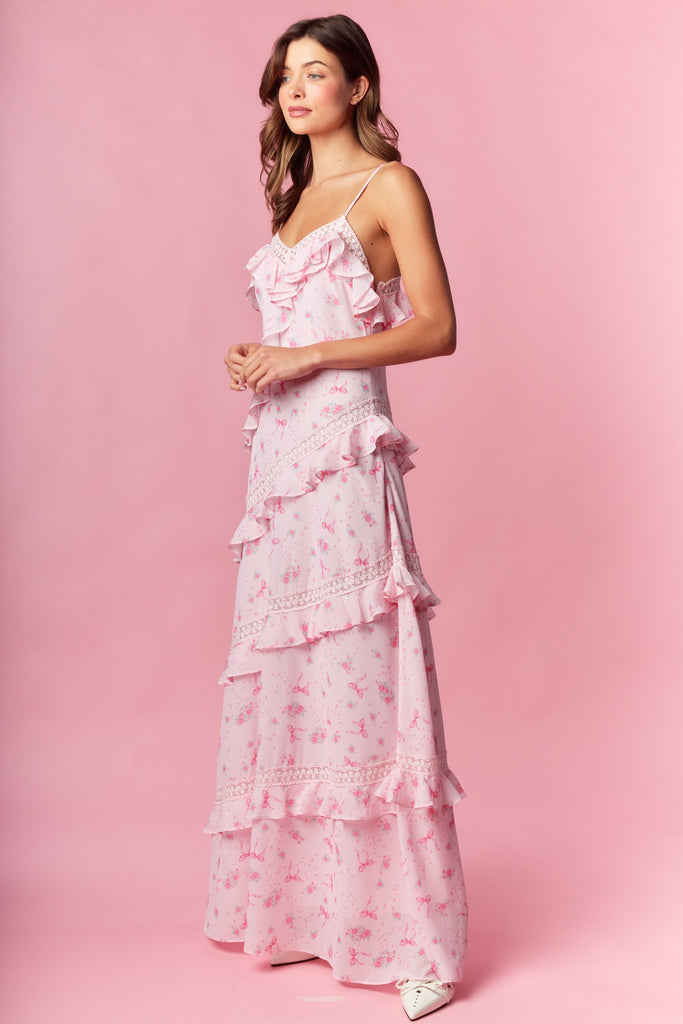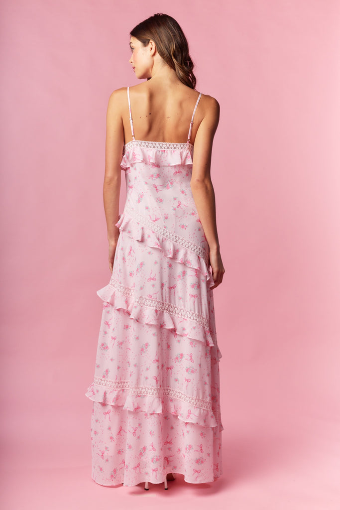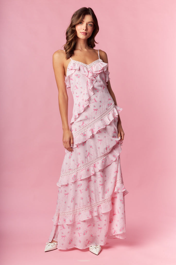 Step into charm with the Pink Petals Dress, where delicate pink bows meet blooming rose prints. Adjustable straps and a back zip closure ensure a perfect fit, while the v-neck lined with lace adds a flirty touch. Diagonal ruffles dance across the body, flowing into a layered hem that brings playful volume to every step. This maxi dress is your go-to for twirling through sunny days and special occasions alike.