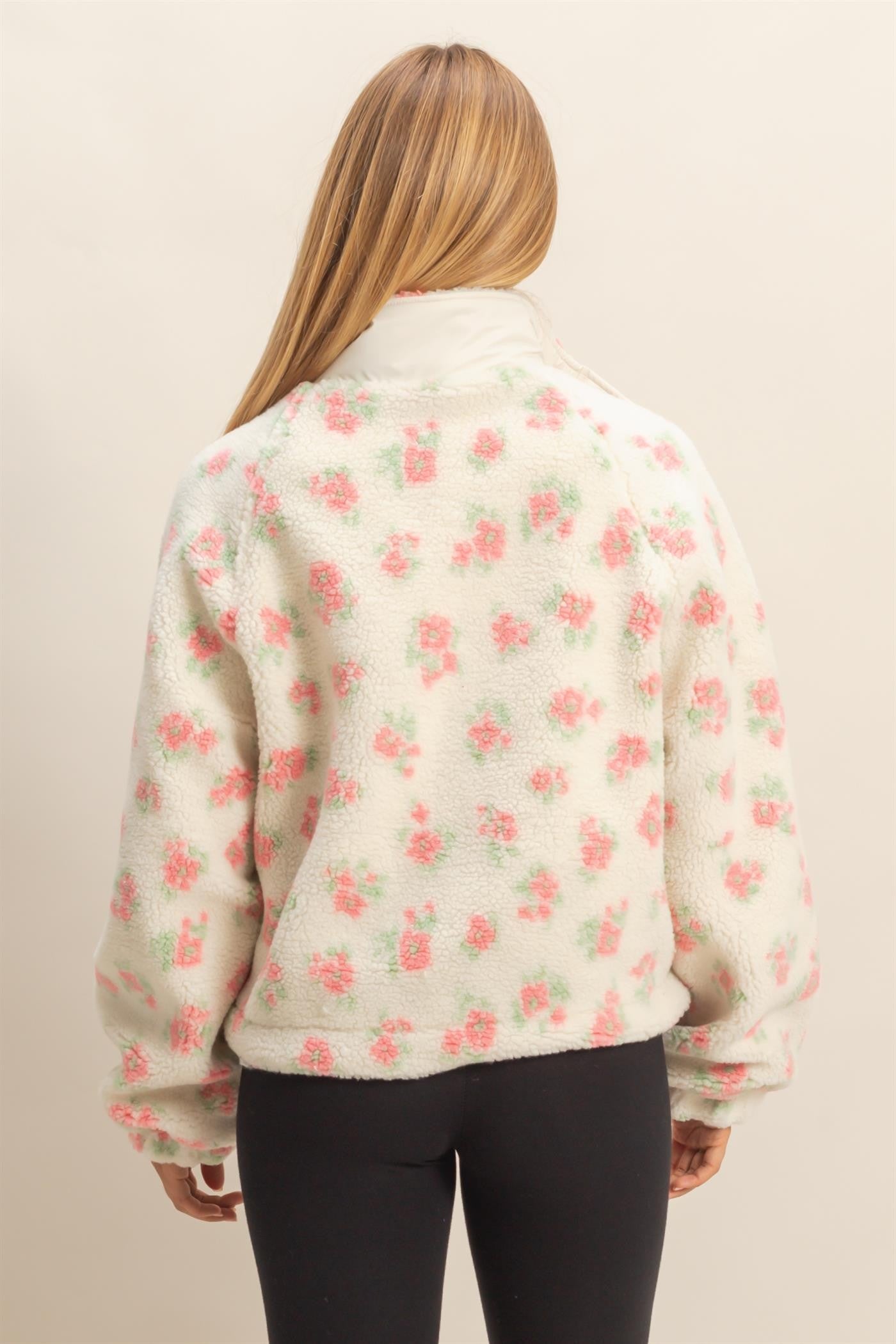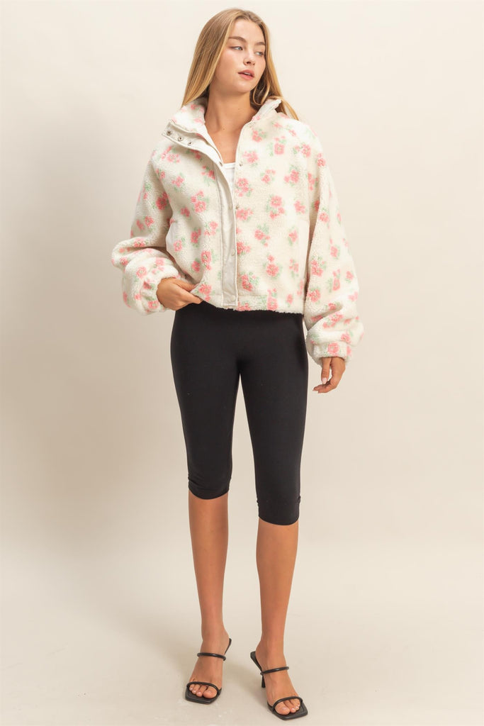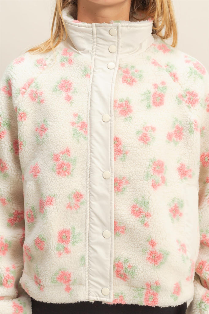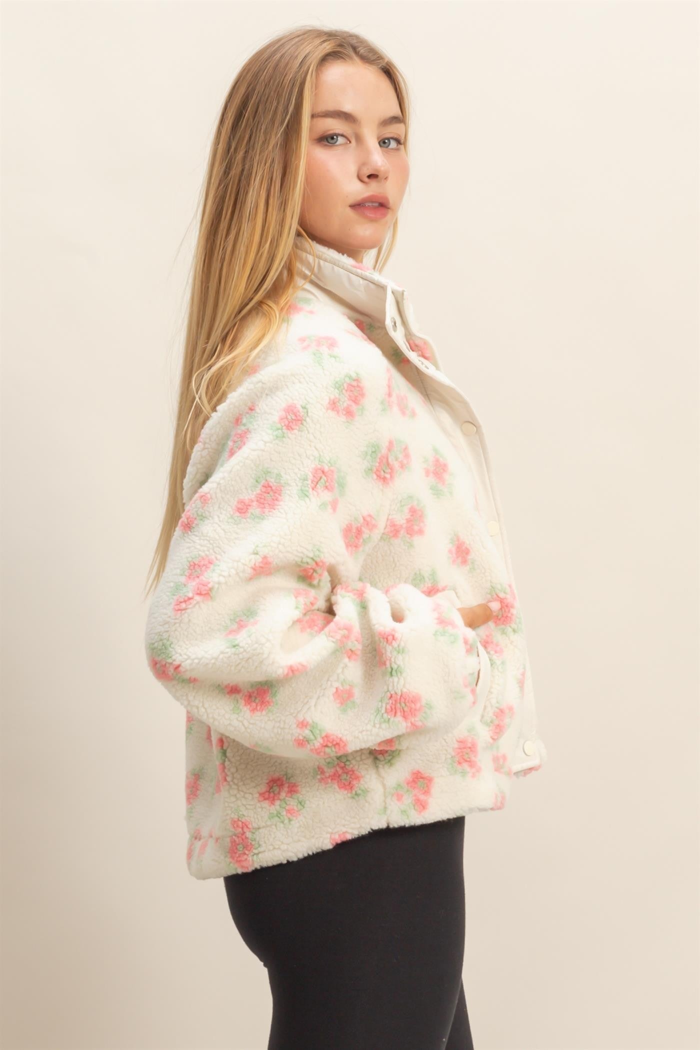 Snuggle into warmth with the Sherpa Petals Sweater Jacket in pink, where cozy meets cute! The soft sherpa fabric wrapped in a charming floral print brings playful vibes to your casual look. Its relaxed fit is perfect for layering over your favorite turtleneck, while pairing effortlessly with denim for easygoing style. Whether you're out for a stroll or chilling with friends, this jacket adds a comfy, cheerful touch to any outfit. Embrace softness and fun in one stylish package!