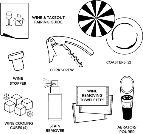 Contains 11 must-haves: aerator/pourer, gold-tone wine stopper, gold-tone corkscrew, coasters (2), stain removing spray, "Last Glass/Keep Pouring" decision coin, wine removing towelettes (3), wine chilling cubes (4), and a Wine & Takeout pairing guide.